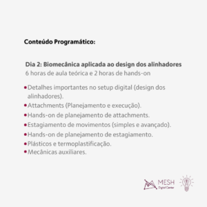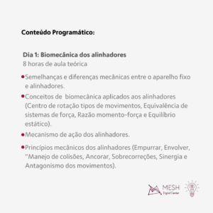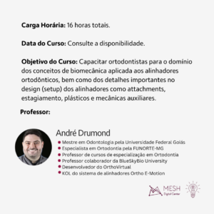 O Objetivo deste curso será capacitar os Ortodontistas para o domínio dos conceitos de biomecânica aplicada aos alinhadores ortodônticos, bem como dos detalhes importantes no design (setup)dos alinhadores como attachments, estagiamento, plásticos e mecânicas auxiliares