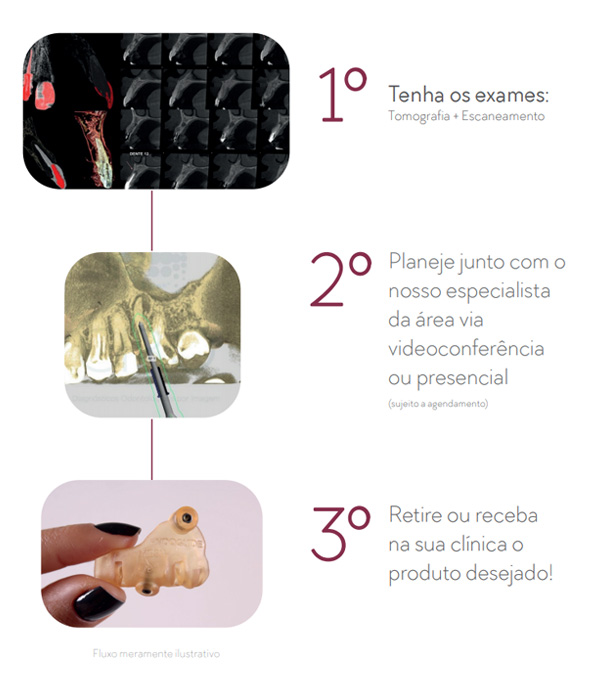 Trata- se de um planejamento reverso onde o dentista e o especialista Mesh realizam o planejamento digital de acesso ao conduto(s) em conjunto para no final obter a guia endodôntica impressa 3D que será utilizada no momento do tratamento endodôntico!